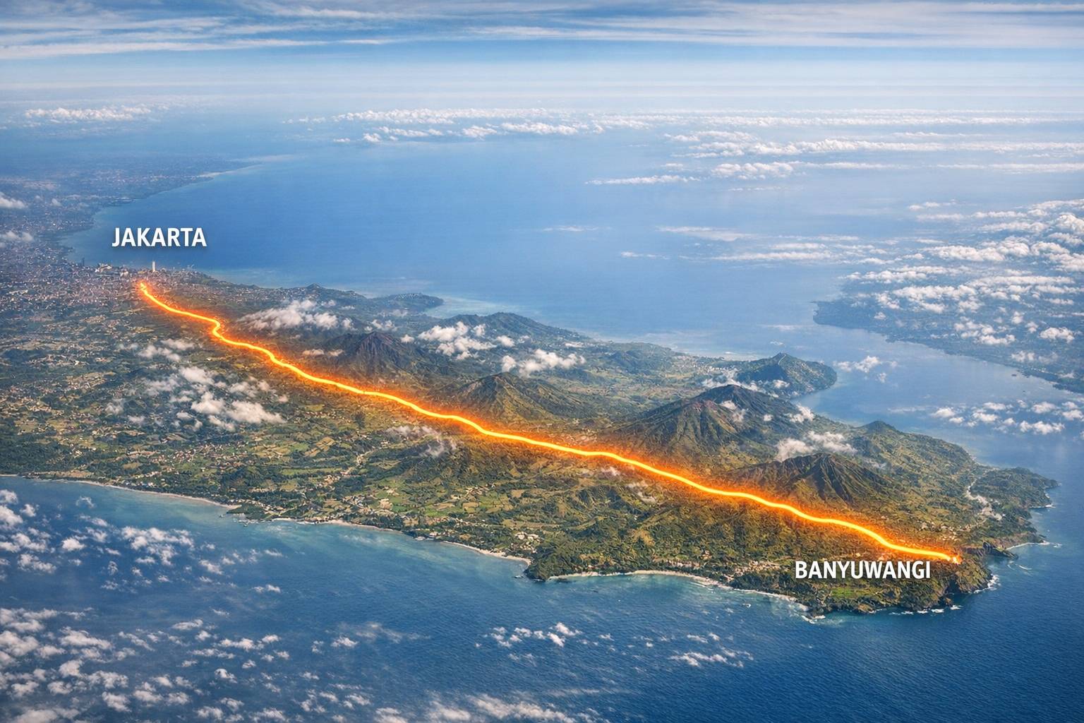 Lebak Bulus/Tomang → Tol Trans Jawa → Surabaya-Gempol → Pasuruan-Probolinggo → Ketapang-Banyuwangi → Feri ke Gilimanuk. Total waktu bilaqu 16-20 jam nonstop. Bisa di-break di Surabaya atau Banyuwangi.