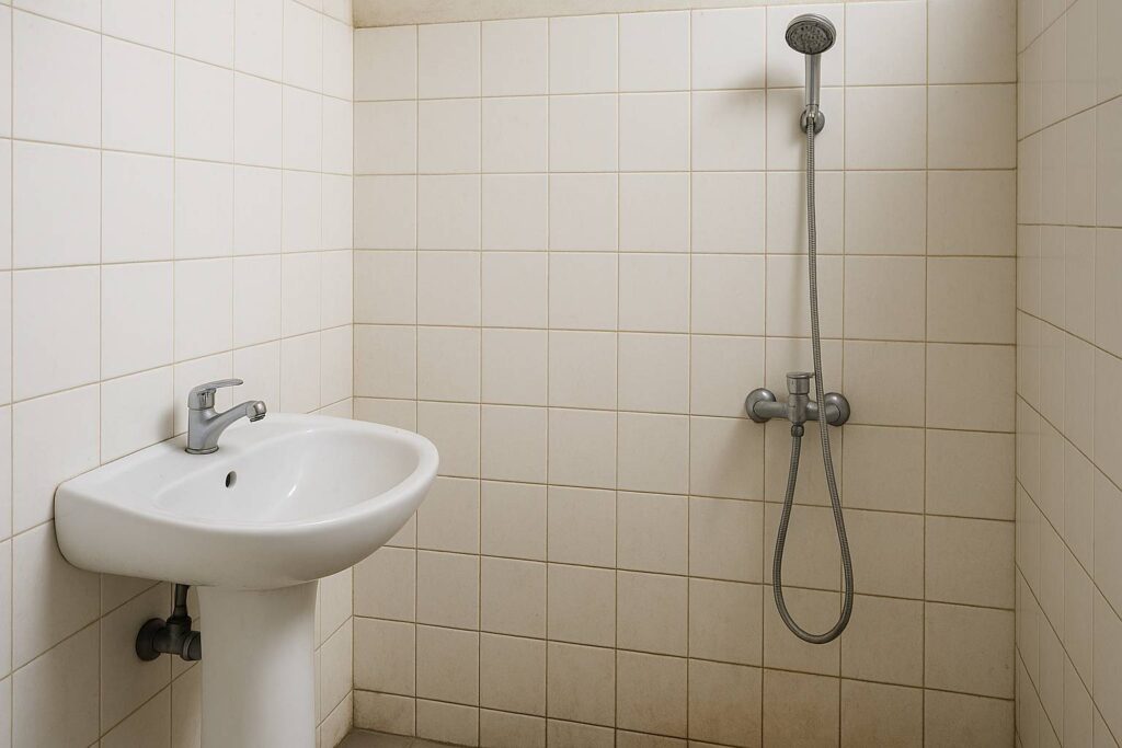Puncak pemakaian biasanya jam 7-9 pagi dan 6-8 malam. Antrean bisa 5-10 orang. Saranku, bangun jam 6 pagi atau mandi malem-malem sebelum jam 10 malam. Kondisi air: air mengalir, tapi tekanannya lemah. Kalau lagi ramai-ramainya, shower cuma ngucurin air tipis-tips. Suhu air dingin—nggak ada pemanas air. Siap-siap mental dan fisik.